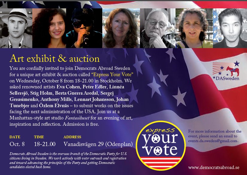 You are cordially invited to join Democrats Abroad Sweden for a unique art exhibit & auction called "Express Your Vote" on Wednesday, October 8 from 18-21.00, at Fantasihuset, Vanadisvägen 29, in Stockholm.